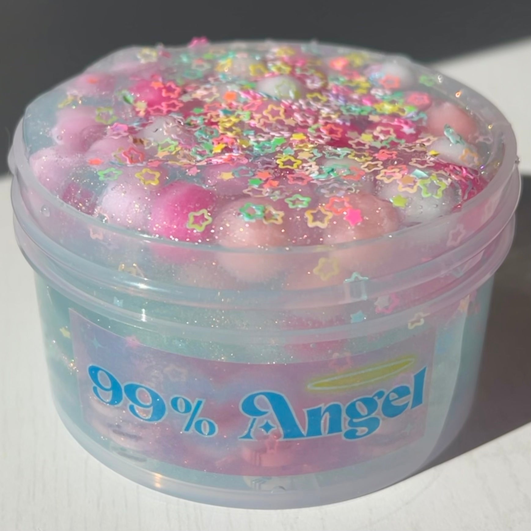 gorgeous pigmented clear slime with cute pink pompoms, pastel star glitters, and kitty fimos. fun to poke, stretch, and pop, or even just admire on your desk. beautiful and shimmery.