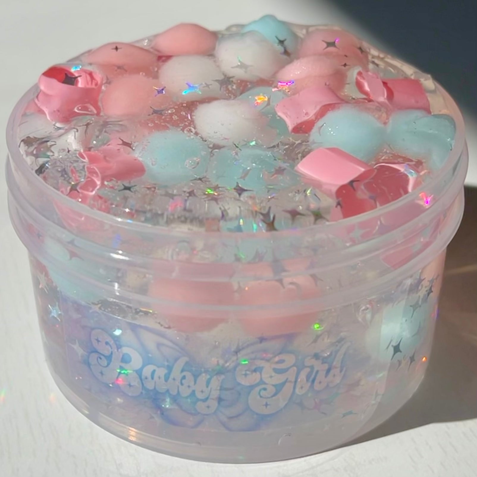 gorgeous clear slime with cute pastel pompoms, heart straw beads, and holo star glitters. fun to poke, stretch, and pop, or even just admire on your desk!