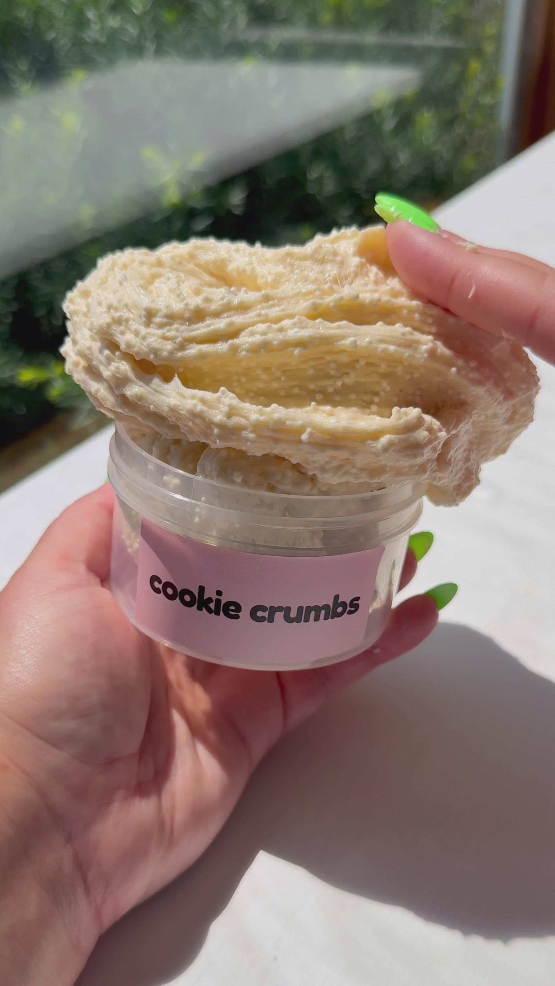 crunchy microfloam slime with creamy white glue base. fun to stretch and squeeze and pop!! feels so good in your hands. comes with sprinkles and cookie charm on the side