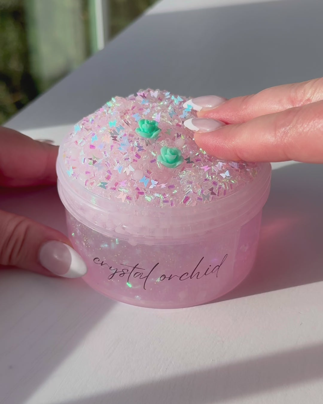 super crunchy bingsu slushee slime with a coated base that makes it less sticky. the clear slime is pigmented and gorgeous in the sunlight. so fun to stretch and squeeze and pop!! topped with glitter & pretty flower charms