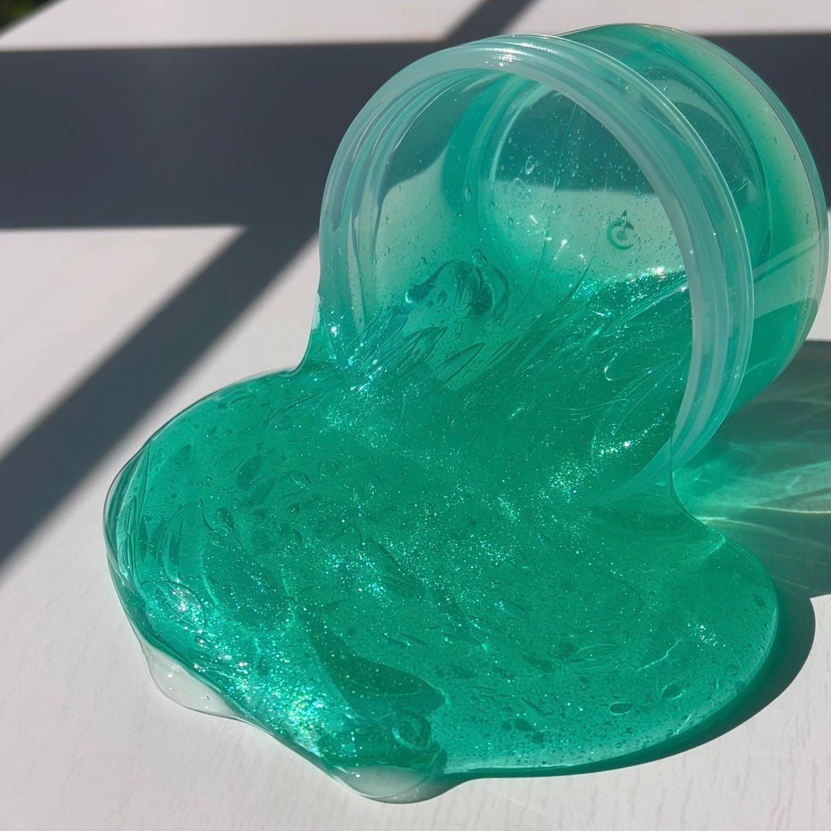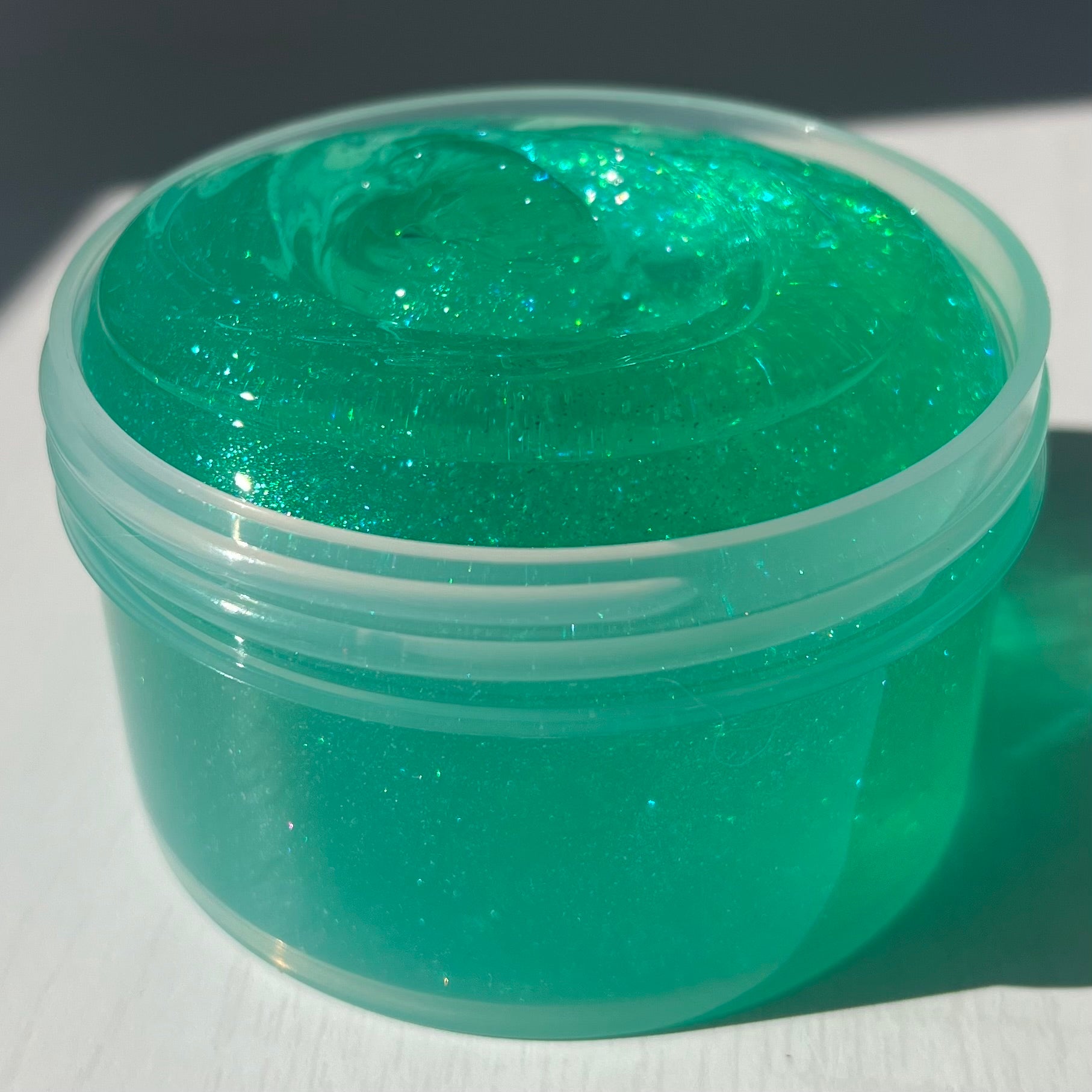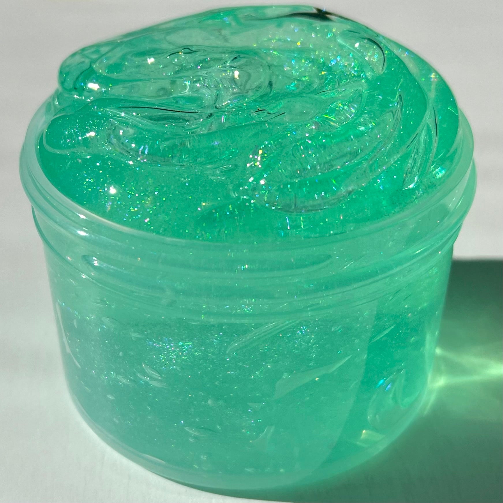 beautiful clear slime with color shifting pigment & a cute shimmery glitter mix. fun for poking, stretching, and popping, or even just admiring on your desk. it's so beautiful in person!