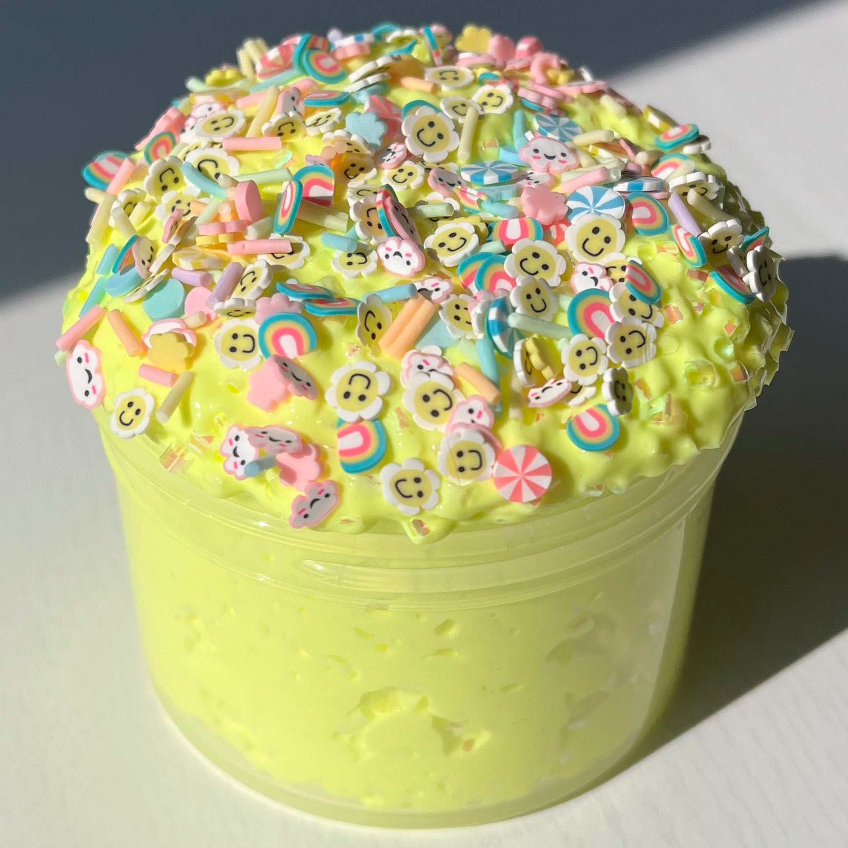crunchy straw bead slime with a creamy white glue base. super addicting texture! stretchy and bubbly. has an exfoliating feeling on hands. comes with cute sprinkles on the side to decorate