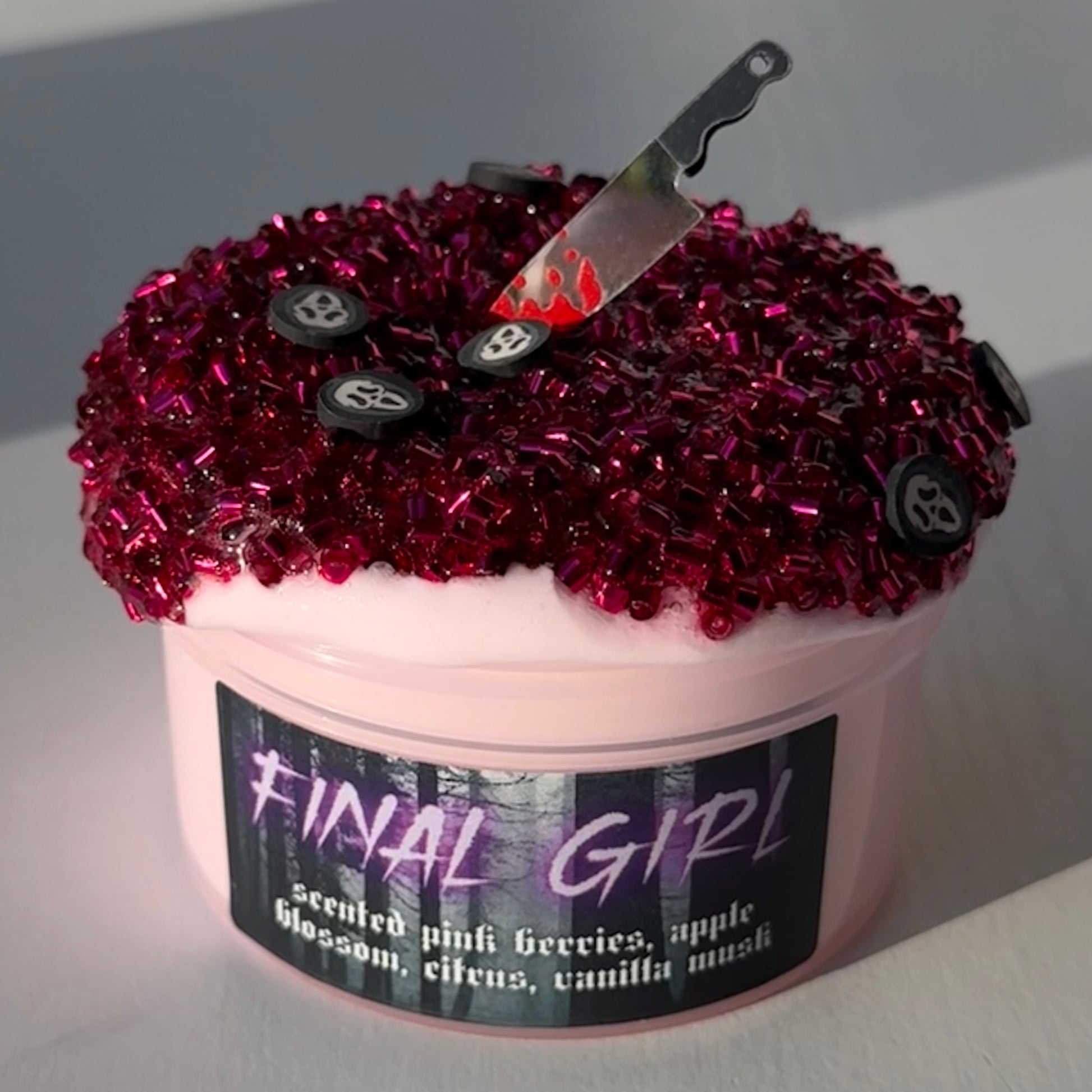 chewy, squishy snow butter with crispy bingsu topper. fun texture contrast and lots of bubble pops! comes with spooky scream fimos and a bloody knife charm