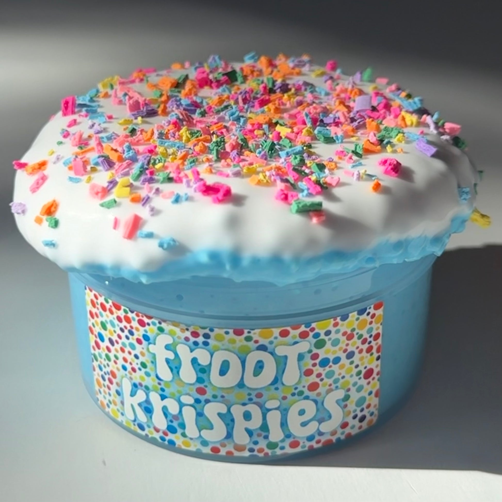 crunchy white glue bingsu that comes with a 1 oz side of mallow topping. when mixed it adds a creamy stretch to the slime. makes great bubble pops!! comes with rainbow crumbs on the side to decorate