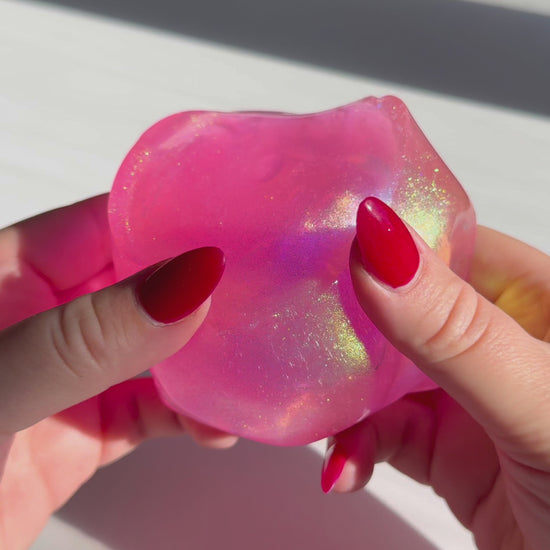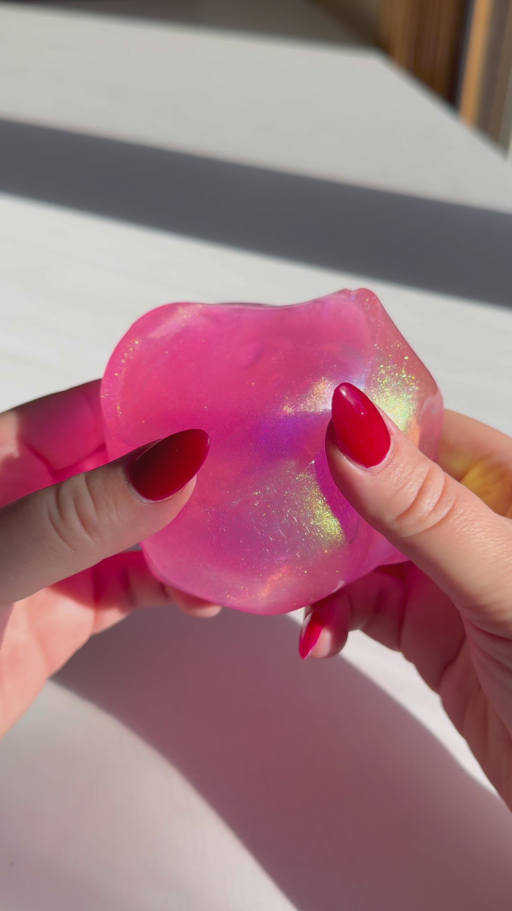 gorgeous color shifting pigmented clear slime. fun for poking, stretching, and popping, or even just admiring on your desk. beautiful and shimmery.