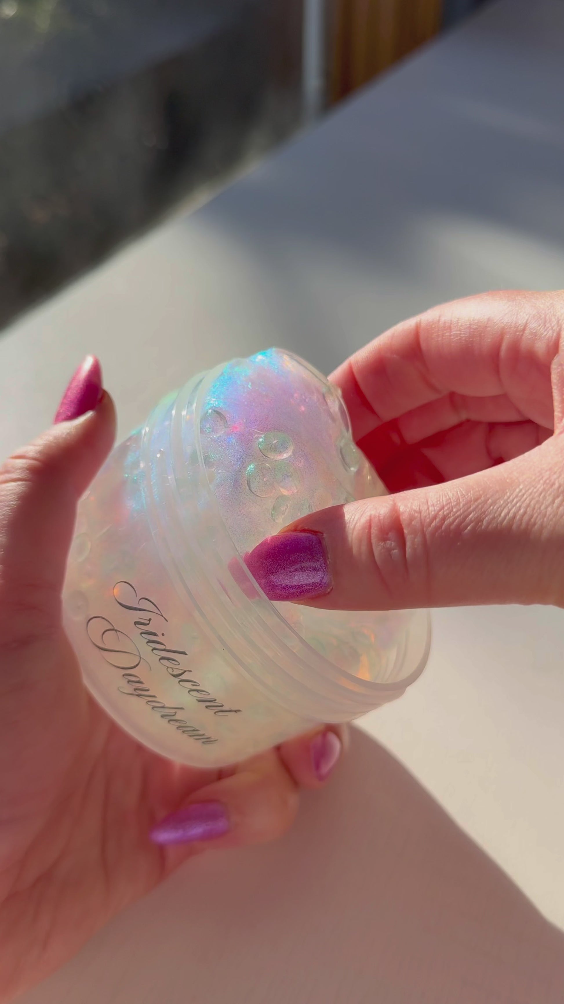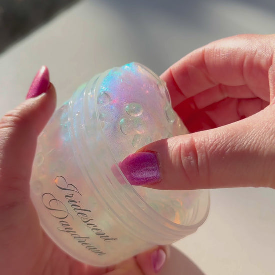 shimmery coated clear with mint green fishbowl beads & smooth slushee beads. bubbly & crunchy texture that's fun to fold and pop. comes with iridescent bubble beads on the side for decoration
