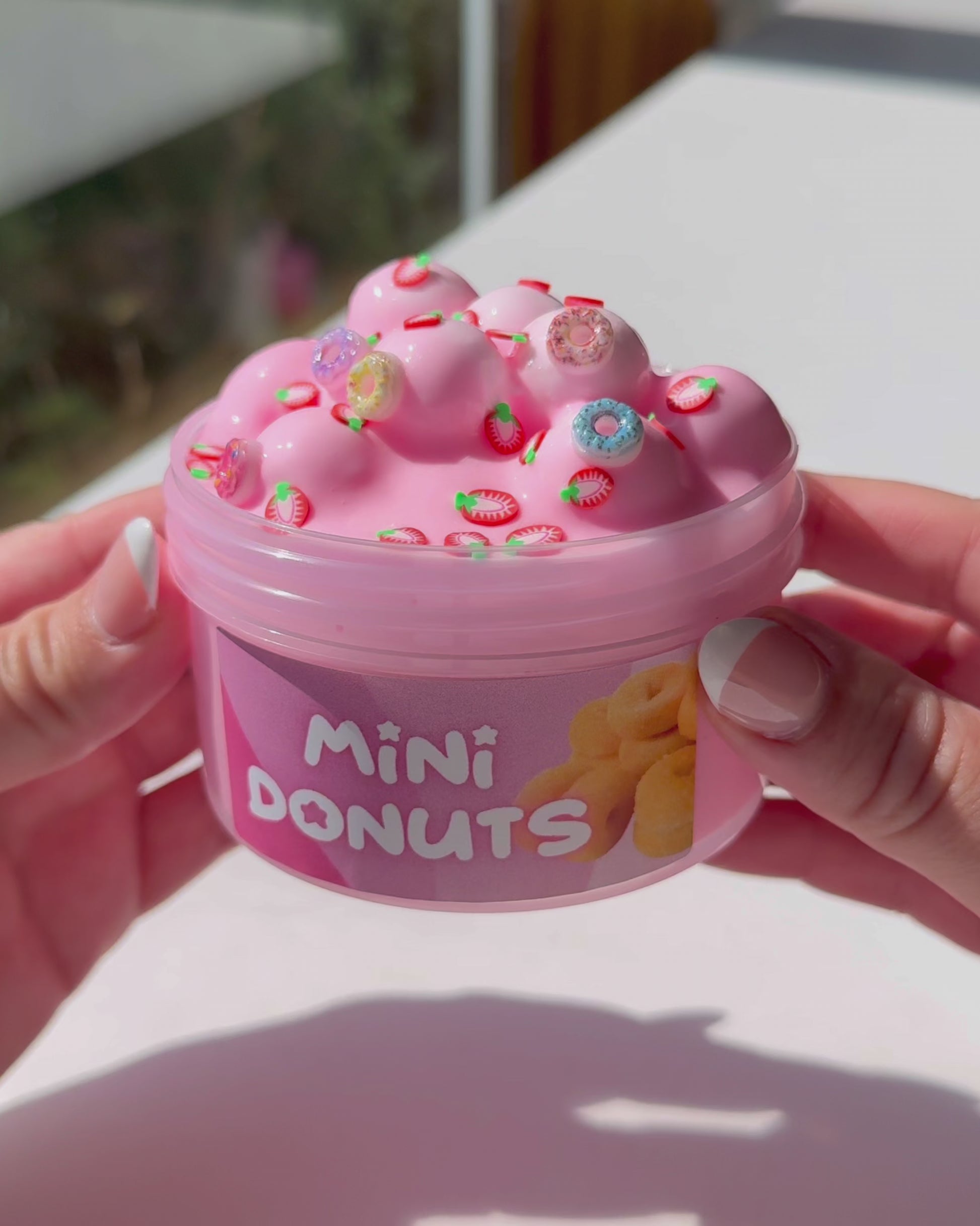 crunchy floam with a creamy white glue base. fun to stretch & pop! comes with strawberry sprinkles & tiny donut charms on the side