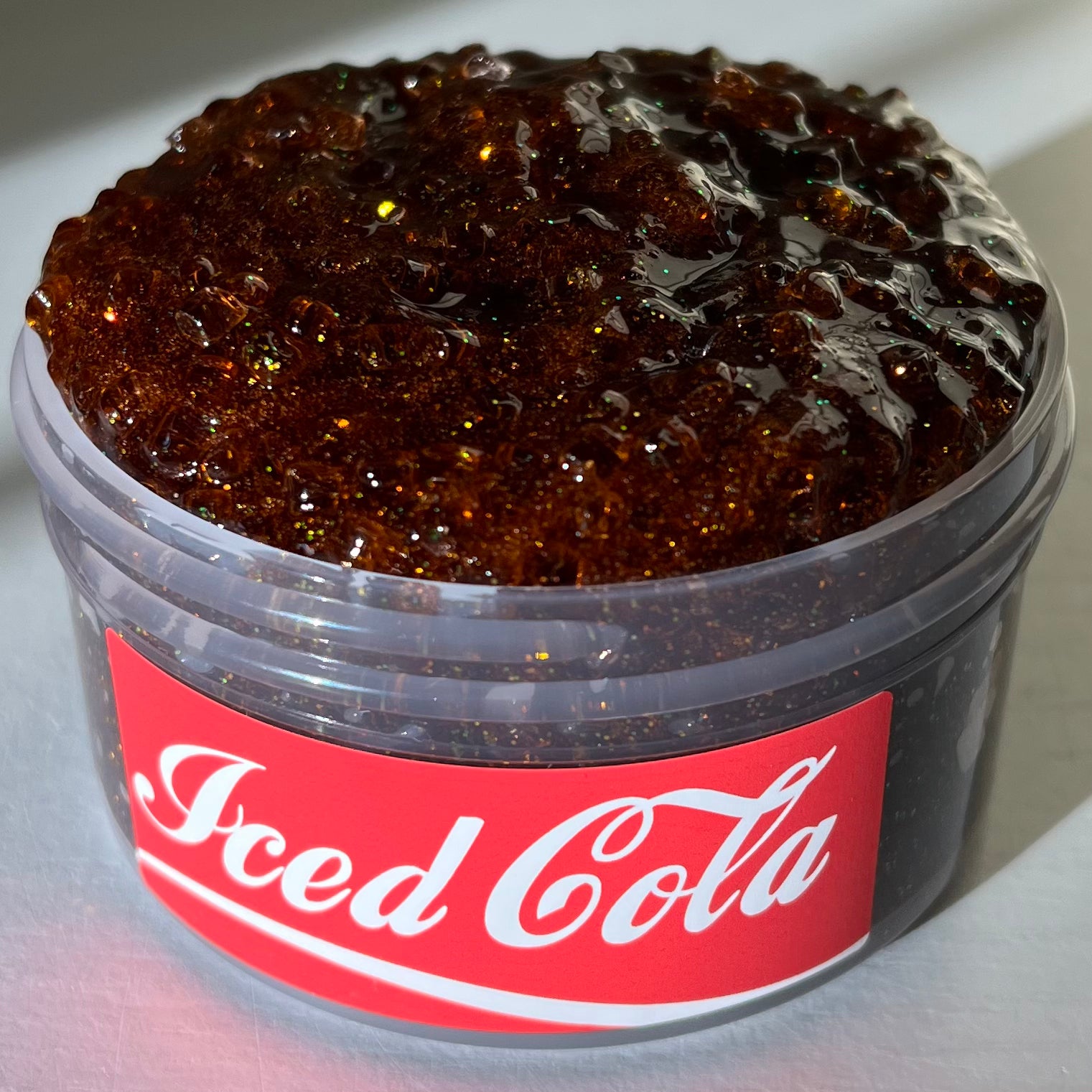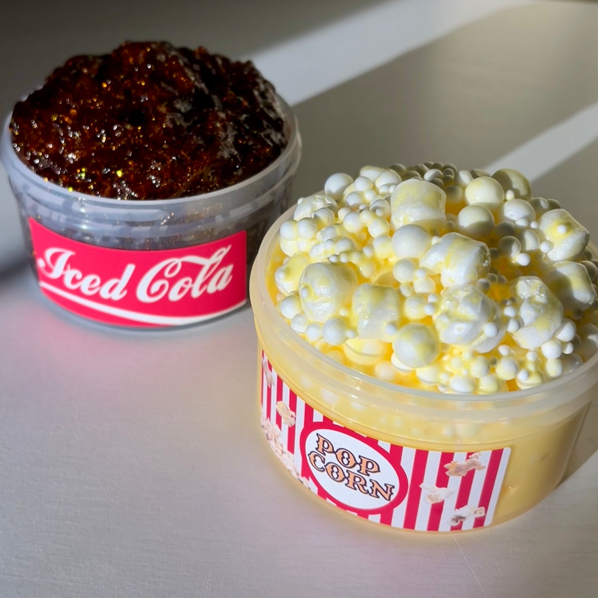 new duo!! super crunchy popcorn floam that smells like buttery popcorn. the glittery sugar scrub smells like fizzy cola.
