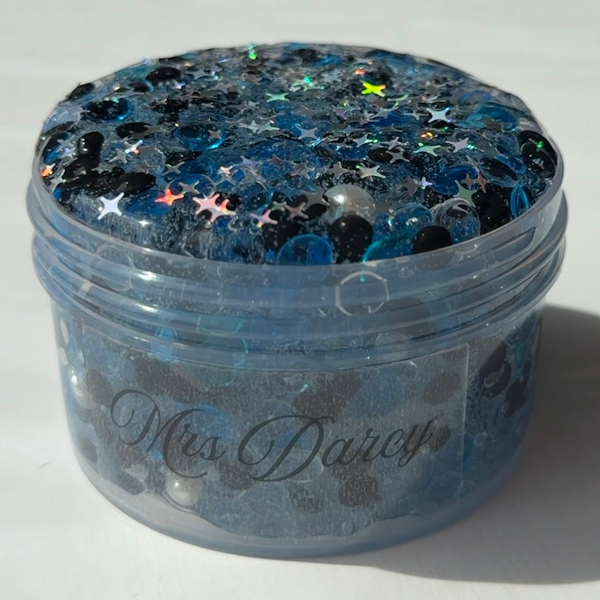 beautiful fishbowl bead slime with coated clear base. includes pearls & silver holo stars mixed in. bubbly & crunchy texture that's fun to fold, stretch, and pop!