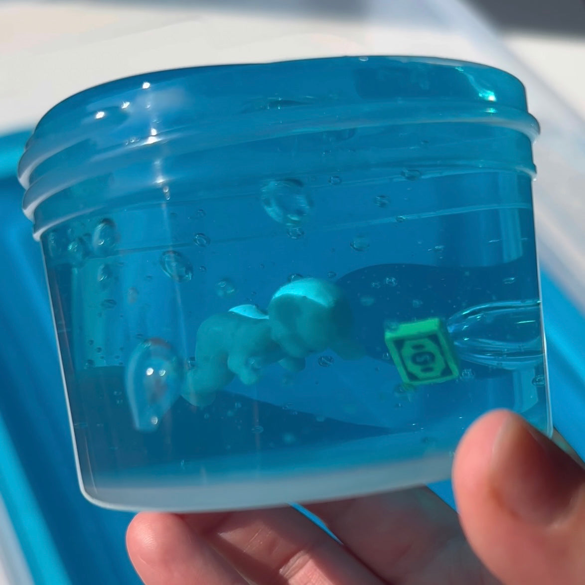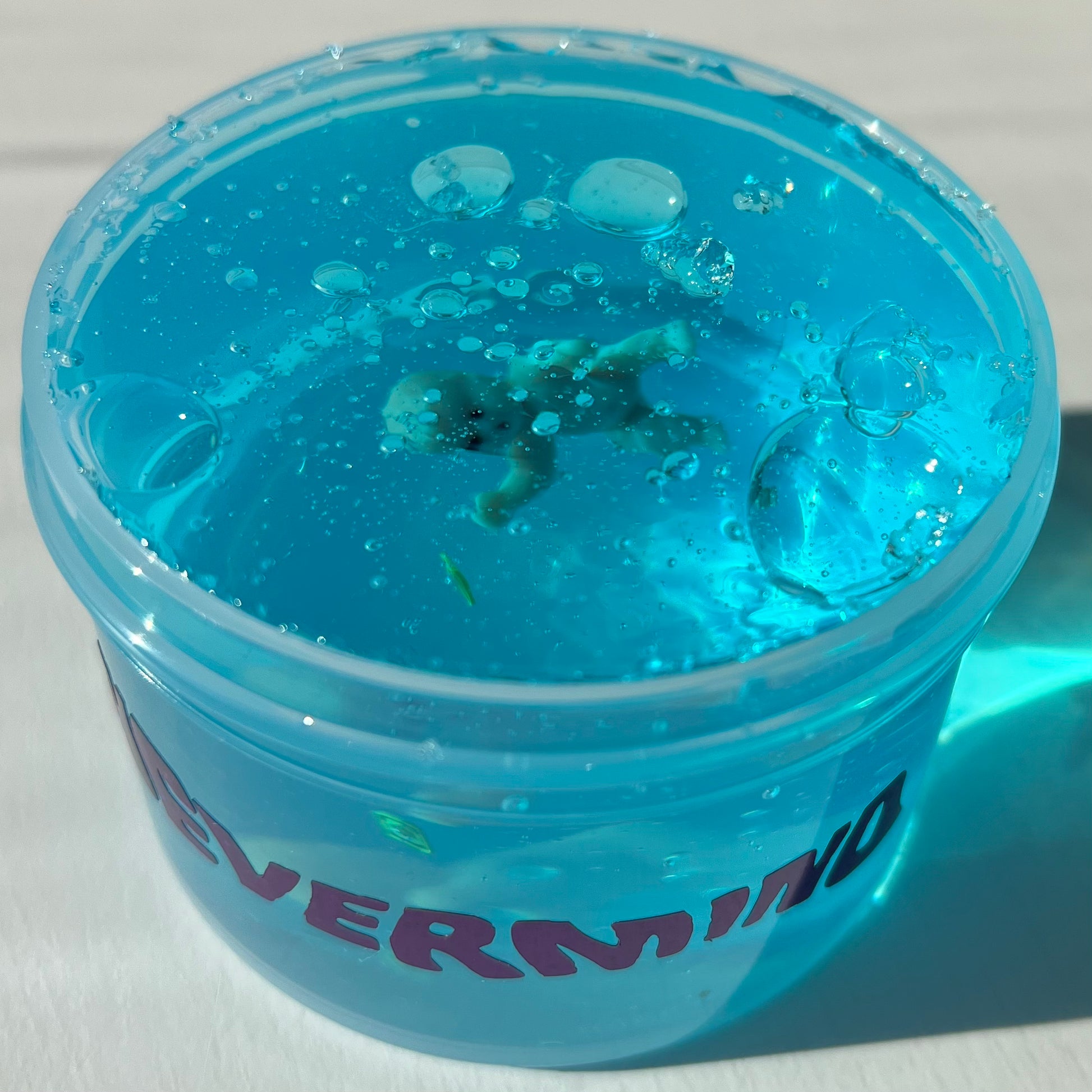 inspired by the iconic nirvana album cover! this scented clear has a fun jello like texture and comes with a baby charm, large cash fimo & custom holo nevermind label. great for poking, stretching, and popping, or admiring on your desk.
