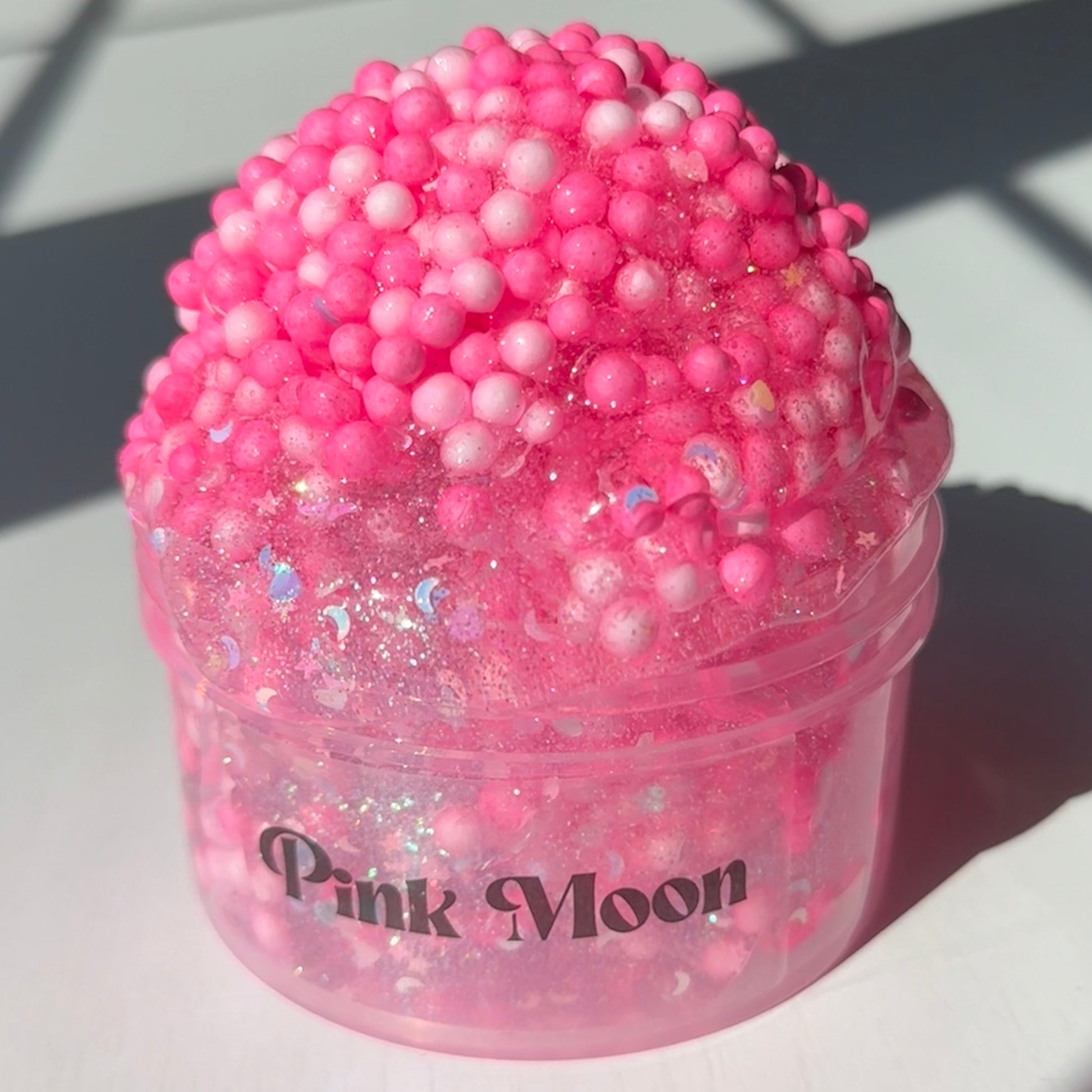 bubbly semi-floam with a coated clear base that feels less tacky! the pigmented clear looks beautiful in sunlight. feels great to crunch and pop! comes topped with cute heart glitters
