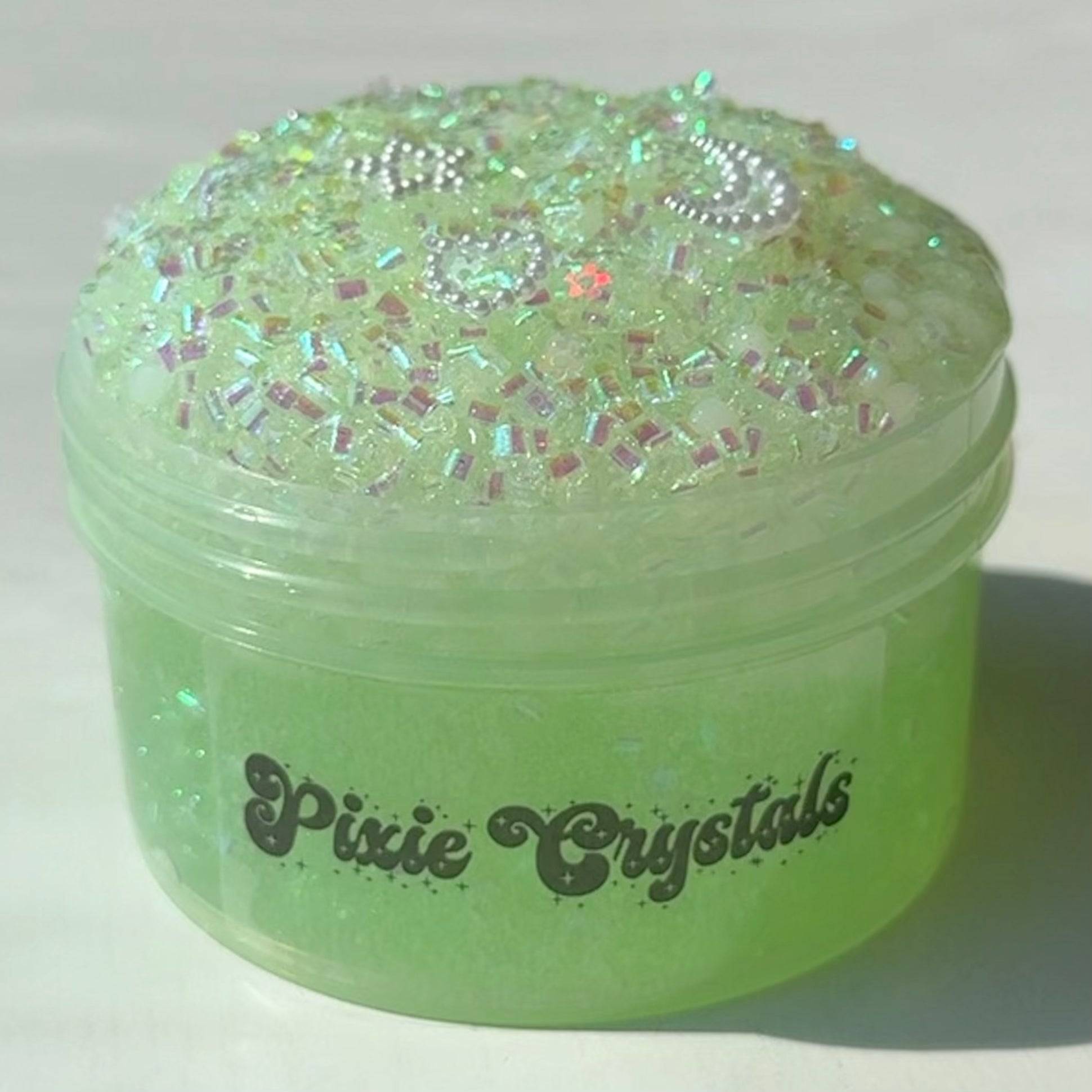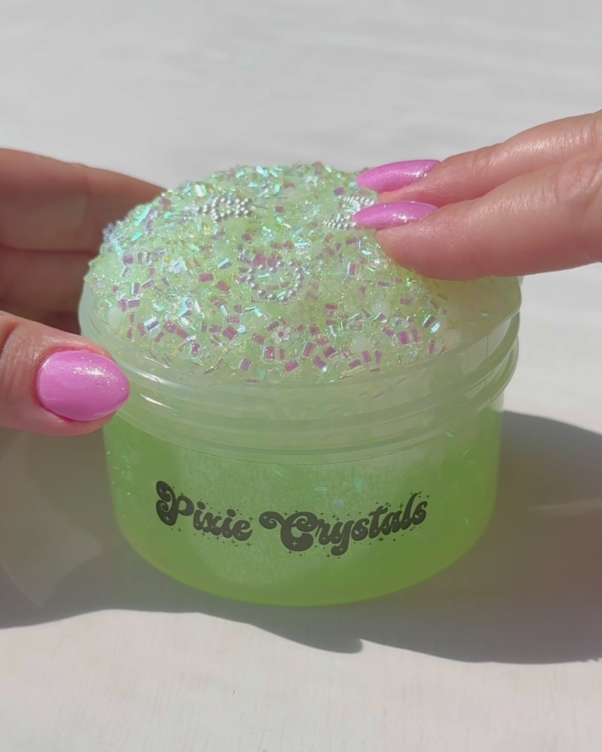 super crunchy bingsu slushee slime with a coated base that makes it less sticky. the clear slime is pigmented and gorgeous in the sunlight. so fun to stretch and squeeze and pop!!