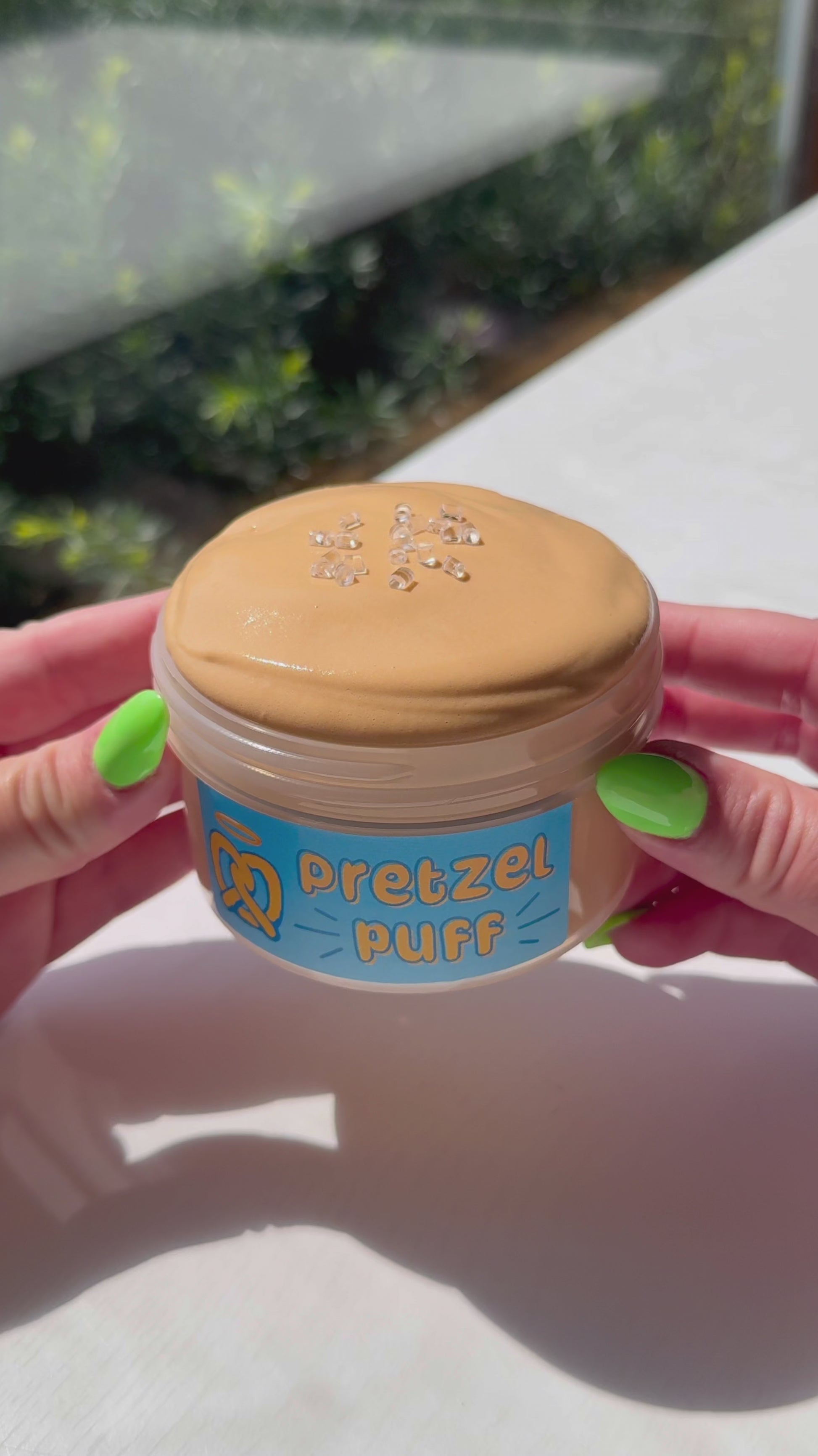 smells like a doughy & buttery soft pretzel topped with cinnamon sugar! soft and squishy texture made with 4 different clays. fun to smush, makes pops and soft sizzles. comes with sugar scrub "salt" beads on the side for decoration