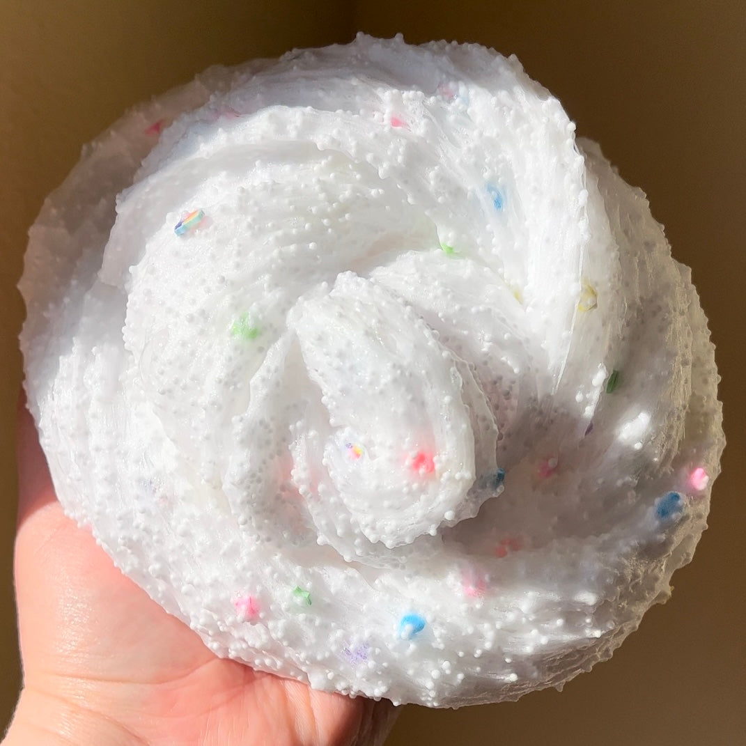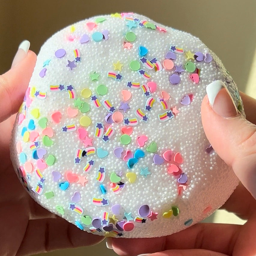 crunchy microfloam slime with a coated base that makes it less sticky. so fun to stretch and squeeze and pop!! feels so good in your hands. comes with adorable sprinkle mix on the side